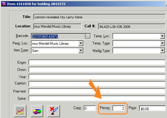Item recordRecord the number of accompanying pieces including the main item in the pieces field. Example: text volume with an accompanying CD. Add "2" in the pieces field of the item record (see the image below) The pieces field should also be used for collection level cataloging to record the number of items included. In those cases, do NOT include the box in the count.